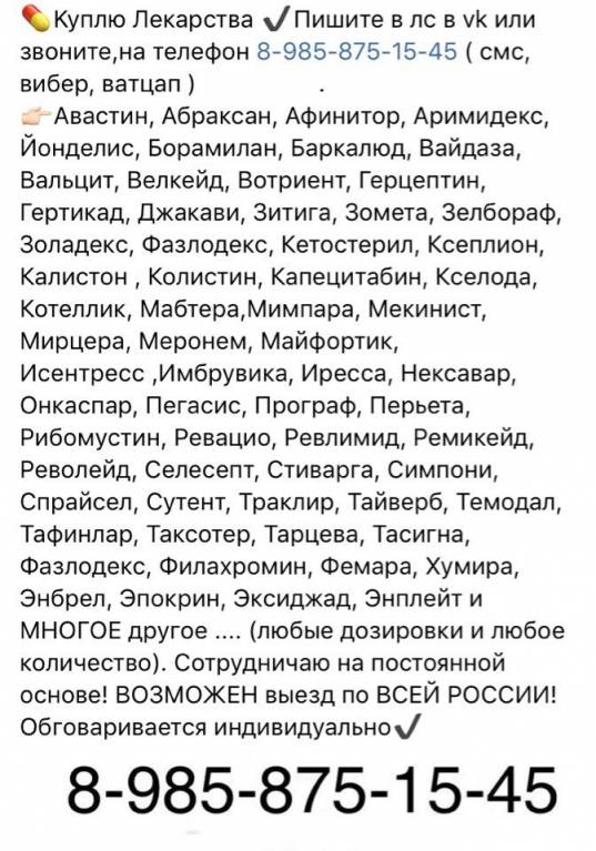 Kyплю Лекарства ✔Пишите в лс в vk или звоните,на телефон 8-985-875-15-45 ( смс, вибер, ватцап ) .