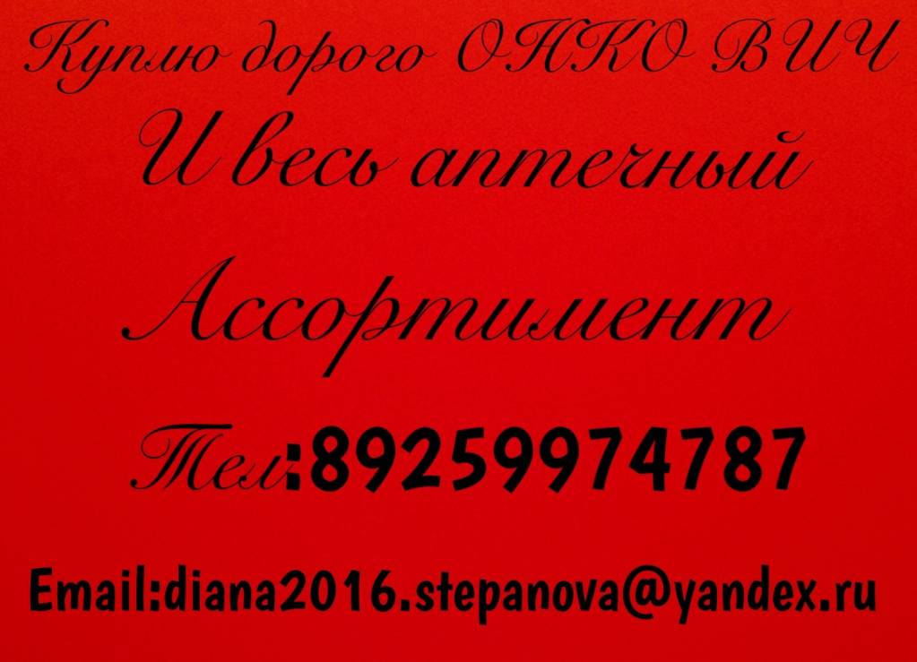 Тел:89259974787.Email:[email protected] u. Покупаю Онко Вич и весь аптечный ассортимент! Предлагаю список покупаемых лекарств! Афинитор Алимпта Акласта Актемра Абраксан Аранесп Армидекс Бейодайм Брилинта Бонефос Вайдаза Викейра Велкейд Вектибикс Вифенд Вотриент Виракомб Гилениа Герцептин Гливек Гиотриф Револейд Ремикейд Ревлимид Ревацио Рибомустин Нексавар Диспорт Джакави Джевтана Зомета Зелбораф Зитига Золадекс Хумира Траклир Тайверб Таксотер Тарцева Темодал Тафинлар Тасигна Тоби Мабтера Мимпара Иресса Интратект Имбрувика Сутент Стиварга Спрайсел Симпони Селлсепт Ксалкори Ксеплион Кадсила Келикс Фазлодекс Энбрел Эксджива Энплейт Эвиплера Йондейлис Октреотид Онкаспар Октагам Оренсия Ервой и многое другое.Нужны Русифицированные препараты.